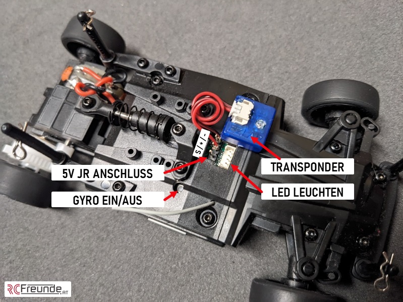 Das Fahrzeug wird mit eingebautem Gyroskop (kurz Gyro) ausgeliefert. Damit soll das Geradeausfahren für Anfänger erleichtert werden, allerdings hat das gerade auf der Rennstrecke auch Nachteile. Die Funktion kann mit einem Knopf auf der Oberseite (Karosserie muss abgenommen werden) deaktiviert werden. Dazu einfach ca. 5 Sekunden den Knopf gedrückt halten, bis die Lenkung in die Neutralposition springt. Ansonsten verfügt die Fernsteuerung über einen Schiebeschalter für die Einstellung der Fahrgeschwindigkeit von 50, 75 und 100%.